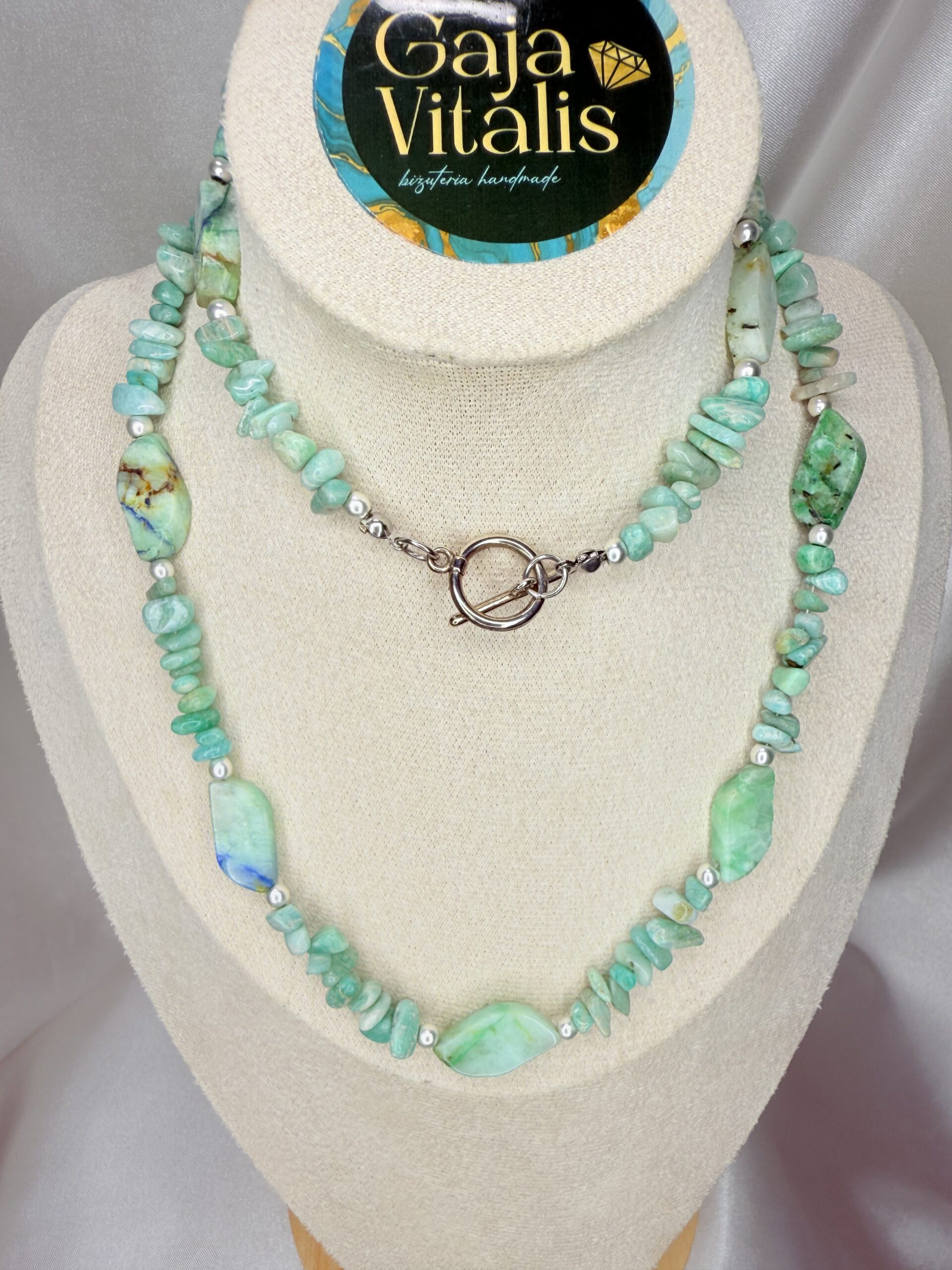 Naszyjnik z amazonitu, chryzokoli i hematytu to wyjątkowa kompozycja naturalnych kamieni, która łączy spokojną kolorystykę z głęboką symboliką. Amazonit kojarzony jest z harmonią i komunikacją, chryzokola symbolizuje spokój, intuicję i równowagę emocjonalną, natomiast hematyt wspiera stabilność oraz ochronę. Połączenie tych kamieni tworzy biżuterię sprzyjającą wyciszeniu, wewnętrznej równowadze i świadomemu wyrażaniu siebie. Naszyjnik wyposażony jest w wygodne zapięcie typu toggle, które stanowi również dekoracyjny element całości, a stal nierdzewna zapewnia trwałość i estetyczne wykończenie. Długość naszyjnika podkreśla jego elegancki charakter i pozwala na swobodne układanie się na sylwetce, tworząc stylowy i wyrazisty akcent.