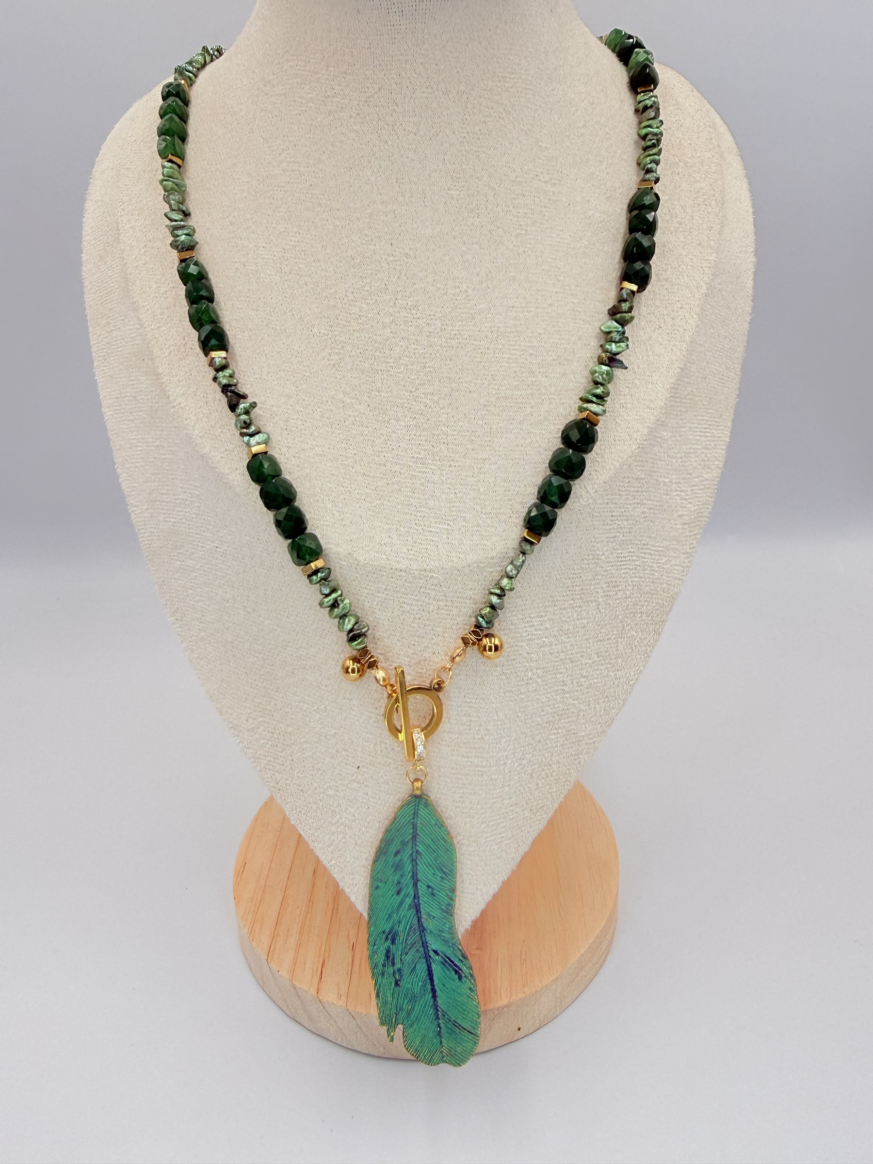 Naszyjnik z pereł słodkowodnych, jadeitu i hematytu to elegancka biżuteria wykonana z naturalnych kamieni, łącząca klasyczną delikatność z wyważoną siłą. Perły słodkowodne od wieków kojarzone są z harmonią, subtelnością i ponadczasową elegancją, jadeit symbolizuje spokój, równowagę i dobrobyt, natomiast hematyt wspiera stabilność oraz ochronę. Połączenie tych kamieni tworzy harmonijną kompozycję, która sprzyja wewnętrznemu spokojowi oraz równowadze emocjonalnej. Zapięcie typu toggle stanowi zarówno praktyczny, jak i dekoracyjny element naszyjnika, podkreślając jego wyjątkowy charakter. Elementy ze stali nierdzewnej zapewniają trwałość i estetyczne wykończenie. Całość tworzy stylowy dodatek podkreślający harmonię i elegancję.